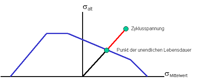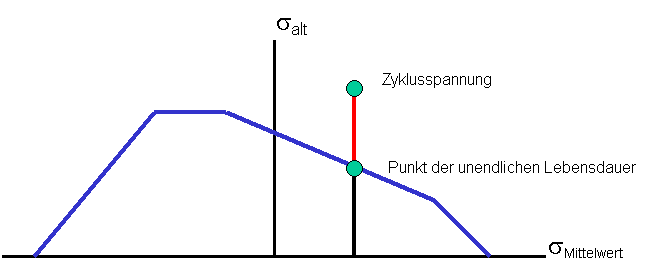 Die Grundlage für die Berechnung des Ermüdungssicherheitsfaktors ist das Verhältnis eines Punkts, der den betreffenden Spannungszyklus (mittlere und wechselnde Spannung) darstellt, und einem Schnittpunkt mit der Linie 'unendliche Lebensdauer'.