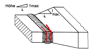 Anmerkung: Werkstattschweißungen, die ausschließlich in flacher Position durchgeführt wurden, entweder manuell oder in einem automatischen Verfahren (nicht mit eingetauchtem Bogen), weisen eine bessere Verstärkungsform auf. Diese Aussage gilt vom Ermüdungs- und nicht vom Standpunkt der Position, des Orts oder der Schweißung mit eingetauchtem Boden aus, so wie bei größeren Wiedereintrittswinkeln im Fußbereich.