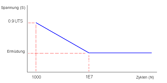 Die spannungsbasierte Kurve wird im Assistenten für die Ermüdungsberechnung auf einem Log-Log-Plot als gerade Linie konstruiert, wobei ein Punkt 90 % der Zugfestigkeit bei 1000 Zyklen entspricht und durch die definierte Ermüdungsgrenze bei (normalerweise) 1E7-Zyklen verläuft.
