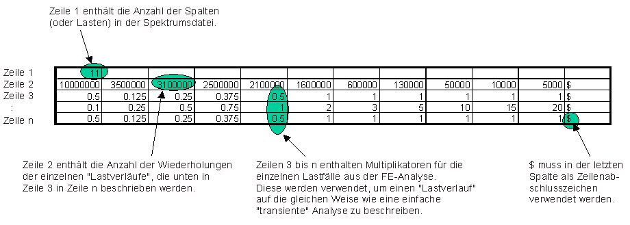 Sie steuern die Spektrumanalyse mit einer durch Komma getrennten Textdatei (.csv), die die Beschreibung der angewendeten Lasten und Wiederholungen der Lasten enthält. Verwenden Sie zur Bearbeitung dieser Dateien einen Text-Editor (z. B. Notepad), und importieren Sie die Datei in Schritt 4 in den Assistenten für die Ermüdungsberechnung.