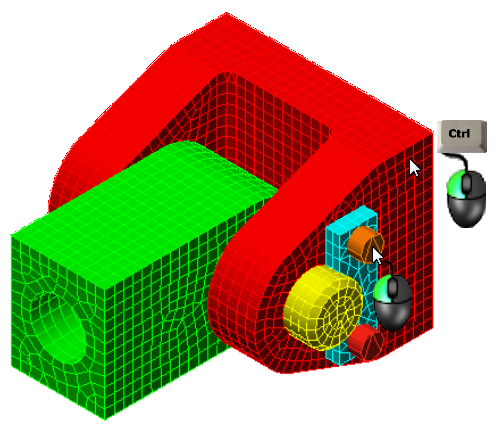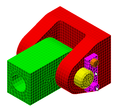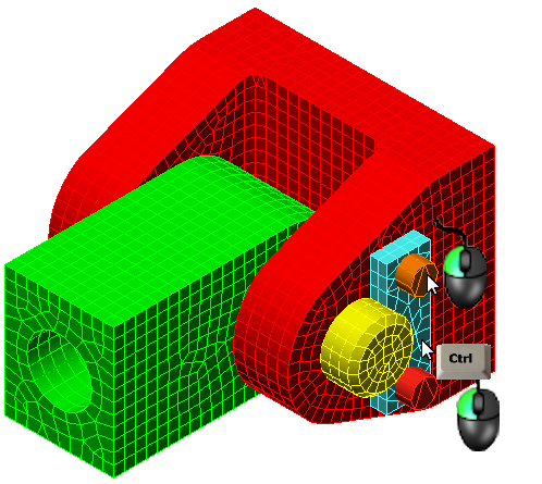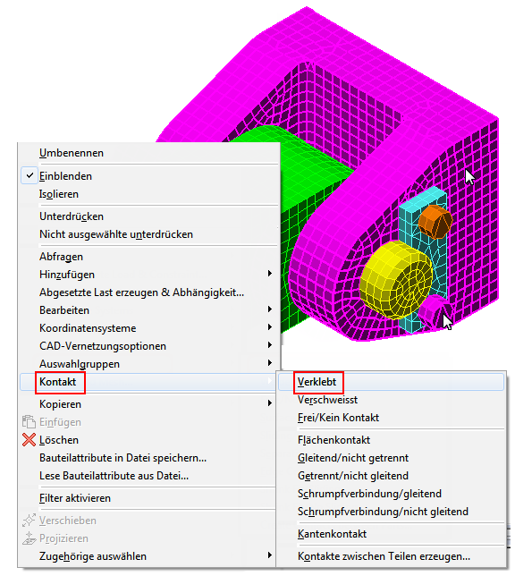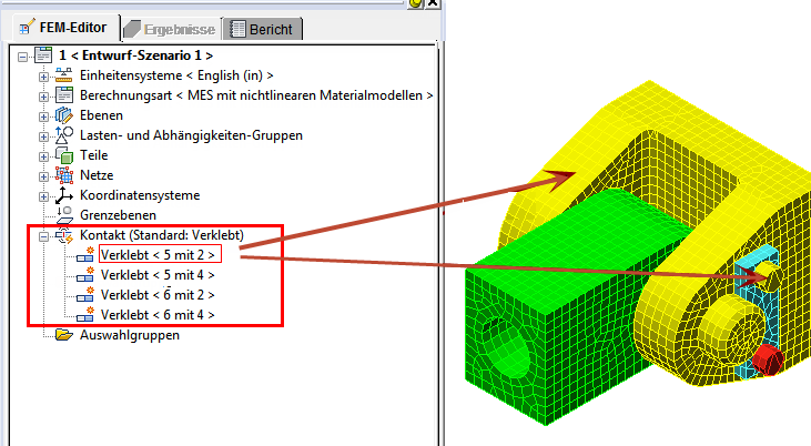 In diesem Schritt ändern Sie den Vorgabekontakt auf einen Oberflächenkontakt. Anschließend weisen Sie einen verklebten Kontakt zwischen den Schrauben und der Gabel sowie den Schrauben und der Halterung zu. Dadurch wird sichergestellt, dass ein realistischer Satz von Kontakten zwischen allen Bauteilen in der Baugruppe gegeben ist.