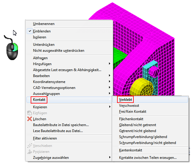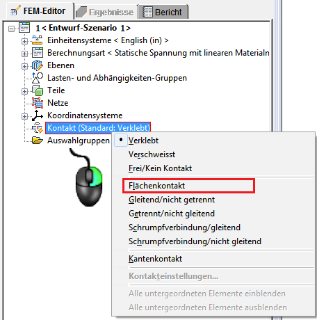 Klicken Sie zum Ändern des vorgabemäßigen Kontakttyps mit der rechten Maustaste im Browser auf Kontakt, und wählen Sie Flächenkontakt aus.