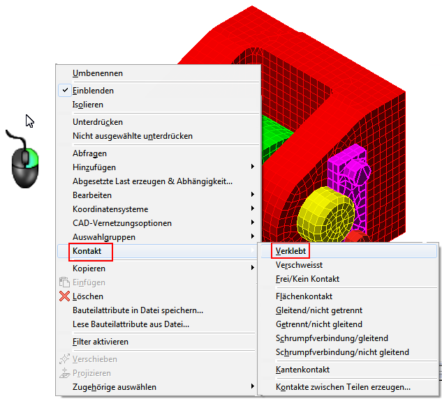 Um einen verklebten Kontakt zwischen einer Schraube und der Halterung zuzuweisen, wählen Sie eine Schraube, halten die Strg-Taste gedrückt und wählen die Halterung aus.