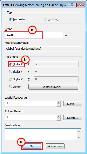 Geben Sie im Dialogfeld Erstellen einer Zwangsverschiebung an Fläche folgende Einstellungen ein: