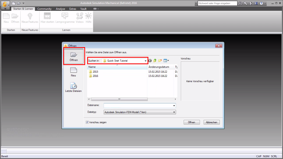 Starten Sie Simulation Mechanical. Klicken Sie im Dialogfeld Öffnen auf Öffnen in der linken Spalte, und navigieren Sie zu dem Ordner, in dem die Feder-Clip-Baugruppe liegt. (Auf Ihrem System sieht der Ordner möglicherweise anders aus.)