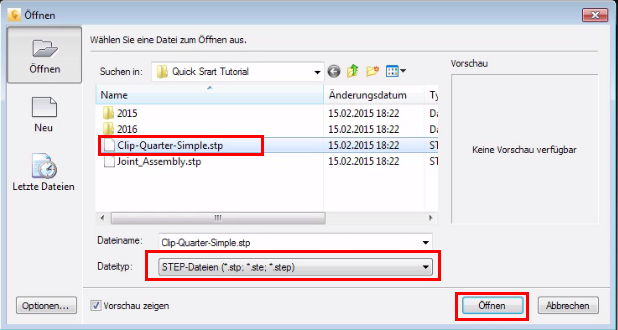 Wählen Sie aus dem Menü Dateityp die Option STEP-Dateien (*.stp, *.ste, *.step ) aus. Wählen Sie Clip-Quarter-Simple.dwg aus, und klicken Sie auf Öffnen.