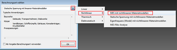 Klicken Sie im Dialogfeld Analysetyp auf den Pfeil, und wählen Sie Nichtlinear und MES mit nichtlinearen Materialmodellen aus. Klicken Sie dann auf OK.