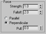 Objects moving perpendicular to a vector field sometimes tend to drift away from it, due to lack of subsampling. The Pull parameter helps to pull objects back. Pull values greater than 0 create a pulling force towards the source of the vector field vector. Values less than 0 pull the force towards the direction in which the vector field's vector is pointing. A value of 0.0 produces a force perfectly perpendicular to the vector field's vector.