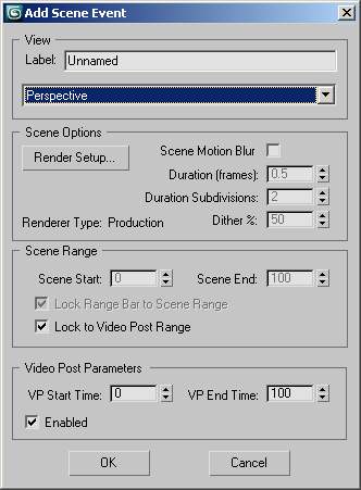 Note: Unlike settings in the Execute Video Post dialog, changes you make to the Scene event rendering options change the Render Setup dialog settings, and vice-versa.