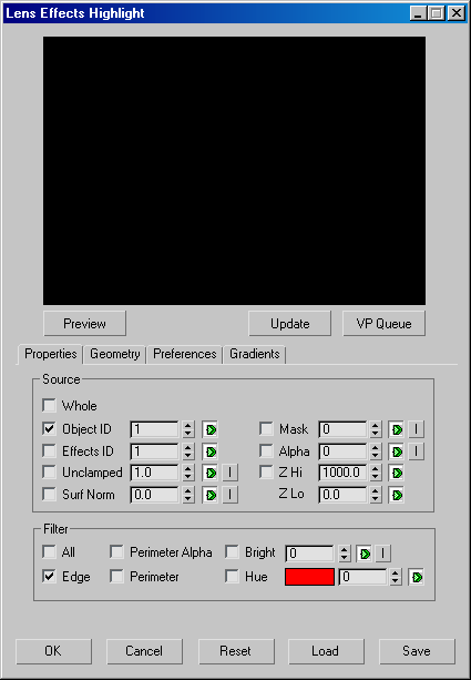 Activates a generic cross star filter so you can quickly set up a Highlight effect. However, as with the Glow module, it is more effective seeing your entire scene and how your effect will interact with your geometry.