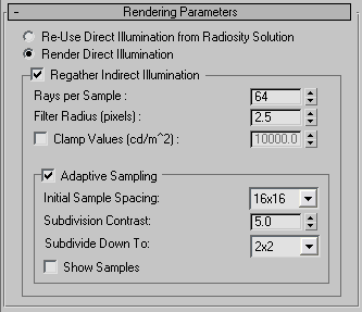 The first two options on the rollout control how the renderer treats direct illumination. Re-Use Direct Illumination From Radiosity Solution provides a quick render that displays colors from the radiosity mesh. Render Direct Illumination uses the scanline renderer to provide direct illumination and shadows. This second option is usually slower but more accurate. With Render Direct Illumination, the radiosity solution provides only the indirect lighting.