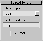 The Scripted behavior lets you create custom behaviors using MAXScript. A scripted behavior can incorporate one of three behavior types: Force, Constraint, or Orientation.