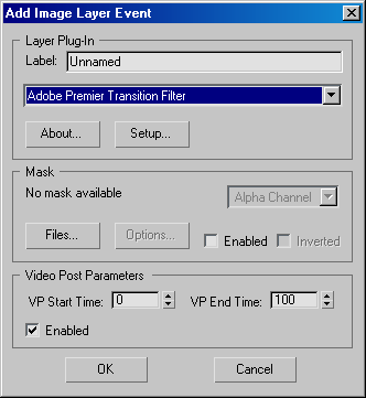 - Enables or disables the event. When turned off, the event is disabled and Video Post ignores it when rendering the queue. Each event must be disabled individually. For example, disabling a composite layer event does not disable the composited image events. The range bars of disabled events are unavailable in the event track area.