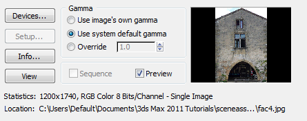 1. On the main menu, choose Rendering View Image File. In the View File dialog, navigate to the \sceneassets\images folder, and highlight fac4.jpg.