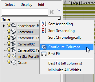 - On the Scene Explorer panel, right-click the column header and from the drop-down menu, choose Configure Columns.