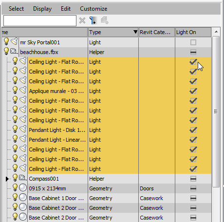 - Click and Shift+click to select all the lights except for mr Sky Portal001 and SunAndSky-002 (which is actually a child of the Helper Compass001).