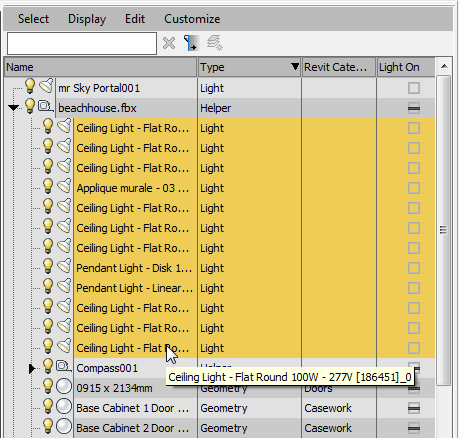 Now all the objects that were imported from the Revit scene file are organized by category.