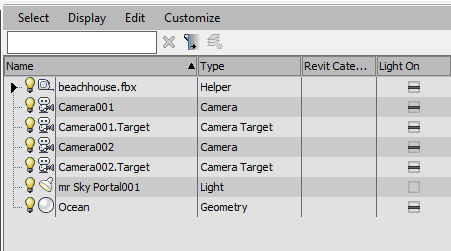 Now the furniture is on a Furniture layer of its own, apart from the other beachhouse objects. You can use Show/Hide, Select and other layer controls for these Revit objects, just as you can with objects created in 3ds Max.