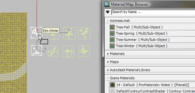 - In the Top viewport, Click and Ctrl+click to select Elm-Winter and Oak-Winter, then drag the Tree-Winter material from the Material/Map Browser