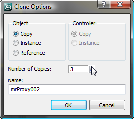Select all four proxy objects and Shift+move them once, downward. In the Clone Options dialog, make sure Copy is chosen, then click OK.