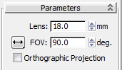 - Go to the Modify panel. On the Parameters rollout, set the Lens value to 18.0 mm and the FOV value to 90.0 degrees.