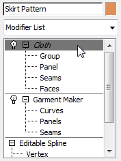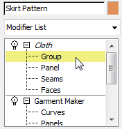 2. On the modifier stack, click (the plus-sign (+) icon) to expand the Cloth hierarchy, then click the Group sub-object level to make it active.