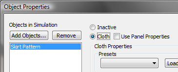 4. In the Object Properties dialog Objects In Simulation list, click Skirt Pattern to highlight it, and then choose Cloth.