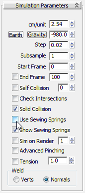1. On the Simulation Parameters rollout, click to turn off Gravity, and turn off Use Sewing Springs as well.