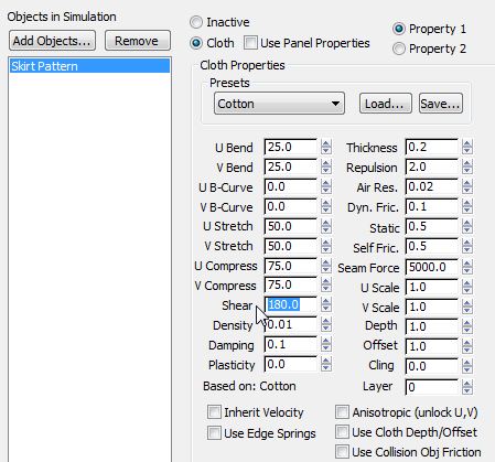 6. In the Cloth Properties group, change the value of U Stretch to 50.0 (this changes the V Stretch value as well). Change the value of Shear to 180.0. Leave the other cloth settings unchanged.
