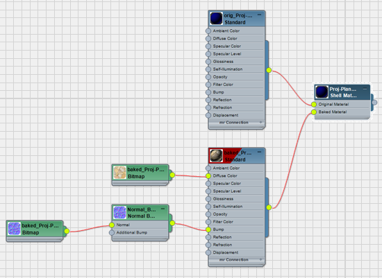 At the right is the top-level node, the Shell material you just inspected. Next to the left are the two sub-materials: The original, renderable material is above, and the baked, hardware material is below. The baked material has a Bitmap node and a Normal Bump map node. Finally, the Normal Bump node uses the NormalsMap bitmap you rendered in the previous lesson.