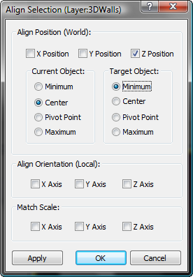 - In the Align Selection dialog, turn off X Position and Y Position. Turn on Z Position. For Current Object choose Center, and for Target Object choose Minimum.