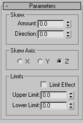 The Skew modifier lets you produce a uniform offset in an object's geometry. You can control the amount and direction of the skew on any of three axes. You can also limit the skew to a section of the geometry.