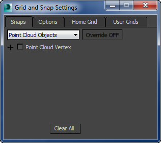 Standard menu: Tools menu > Grids and Snaps > Grid and Snap Settings > Grid and Snap Settings dialog > Snaps panel > Choose Point Cloud Objects from the drop-down list.