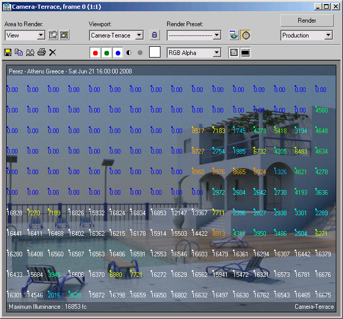 Tip: While 3ds Max allows you to display both Image Overlay values and Light Meter values in the same rendering, usually this is not very legible. It is more useful to render either one or the other at a time.