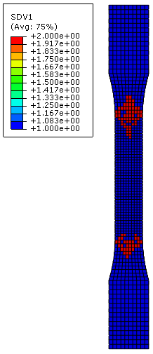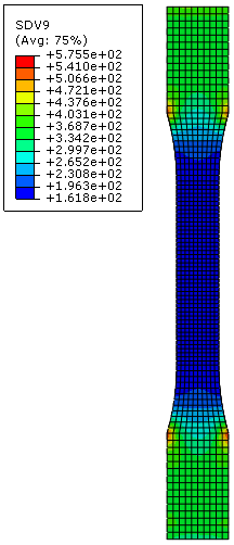 Step through the analysis and monitor SDV9 as the tensile displacement load is applied to the coupon. Notice how the values of SDV9 in the notched gage region are much lower than the remainder of the coupon. This indicates a large amount of plasticity, or material softening. (Shown at Time = 0.85).