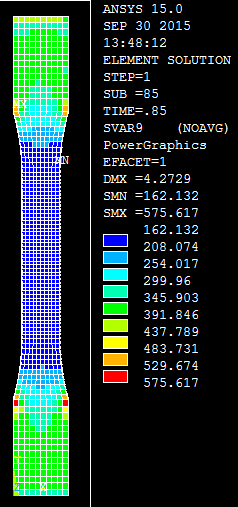 Step through the analysis (Main Menu > General Postproc > Read Results > By Load Step) and monitor SVAR9 as the tensile displacement load is applied to the coupon. Notice how the values of SVAR9 in the notched gage region are much lower than the remainder of the coupon. This indicates a large amount of plasticity, or material softening.