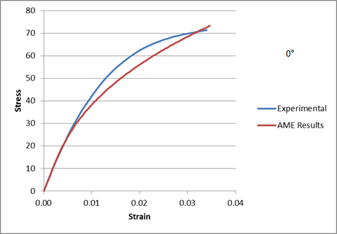 We can see a very good agreement between the experimental data at zero degrees and the outputs from Advanced Material Exchange. Keep in mind, Advanced Material Exchange uses a stress-based failure criterion, so the fact that we get a very similar ultimate stress for each curve gives us confidence that the tool can be used reliably going forward.