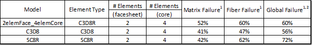 The models only differ in the type of element, i.e., the materials, mesh density, and boundary conditions are exactly the same in each model. Three Abaqus element types are tested: C3D8R, C3D8 and SC8R. Each of the three models uses the same through-the-thickness mesh density. Four elements were used for the foam core and each composite facesheet is divided into two elements for a total of eight elements through the thickness of the sandwich laminate.