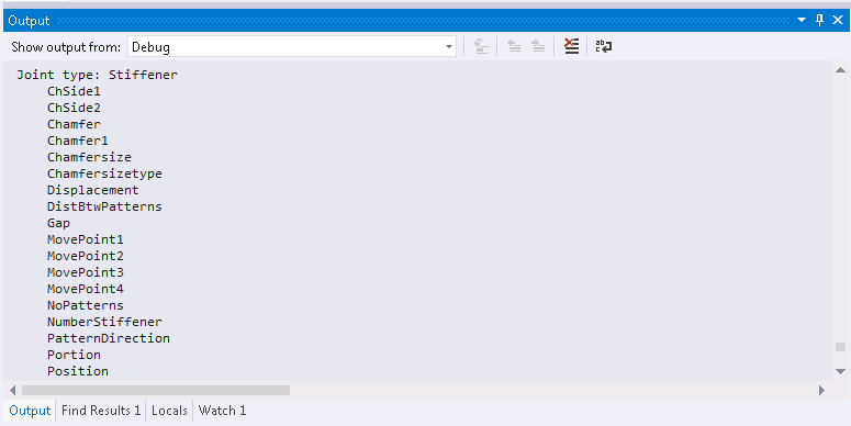 The method above will get all the joints in the file from the DatabaseManager, then iterate through them, writing out the name and parameters to the debug window. You will see something like this:
