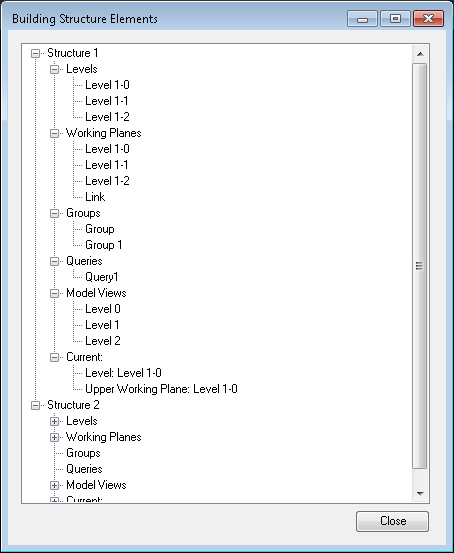 The BuildingStructureManager has a list of BuildingStructureObjects, each of which represents a Structure in the Project Browser. Each BuildingStructureObject has one BuildingStructureTreeObject for each set of data associated with the Structure, such as model views and groups. They are obtained as properties of the BuildingStructureObject class: LevelTreeObject, WorkingPlaneTreeObject, GroupsTreeObject, QueriesTreeObject, and ModelViewsTreeObject. The code above creates a node in the TreeView for each category of data and then lists the names of the objects contained in the list.
