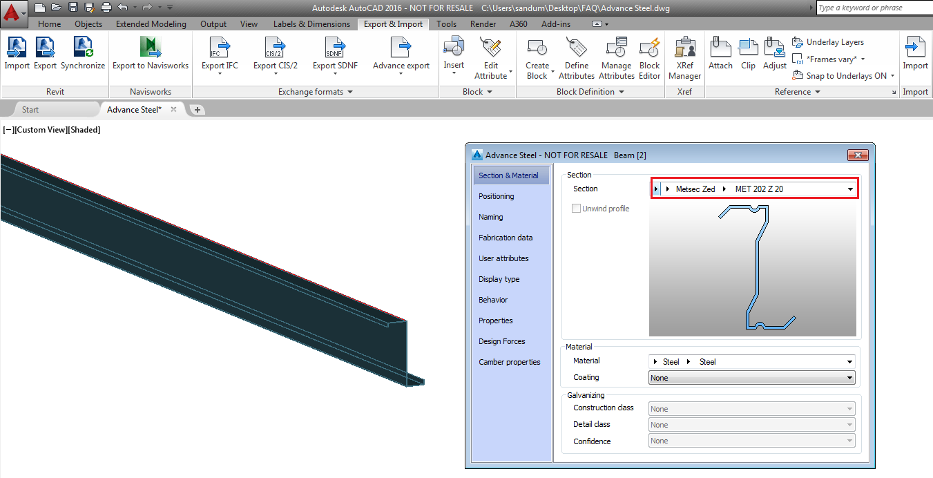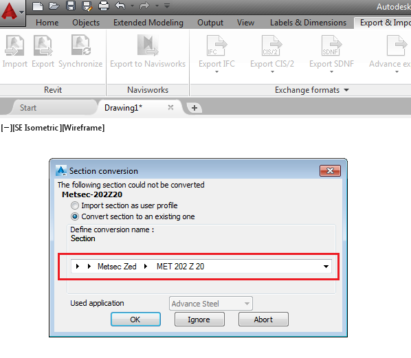 The Profile Type "Metsec-202Z20" was set as the GTC Section inside the smlx file.