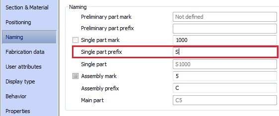 A text prefix, separate for single part and assembly marks, can be put in front of the part mark (e.g. columns can be marked with the prefix S).