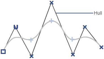 CVs (control vertices) control how the curve is “pulled” from a straight line between edit points. They are the most basic and important means for controlling the shape of a curve. Lines between consecutive CVs form the control hull.