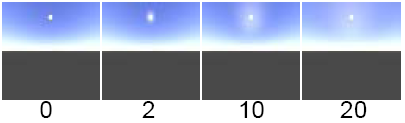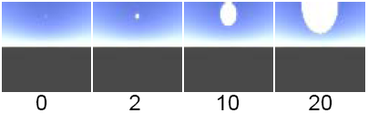 The clouds are scaled and positioned by adjusting the Power option. The cloud density is achieved by subtracting the Threshold from the pixel value clipping to 0, then multiplying the result with Density. To control the amount of unfocusing of the Cloud_texture, adjust the Blur value (under Sun Parameters). The valid range is 0 to infinity. The slider range is 0 to 1. The default value is 1.