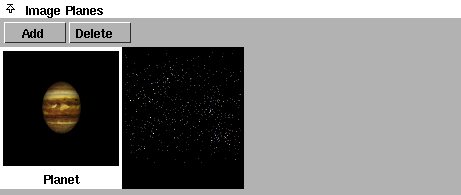 The Image Planes section of the Camera Editor contains a list of image plane swatches for the current camera, and buttons that let you add a new image plane to the camera or delete an existing image plane.