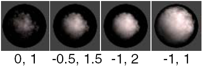Determines how diffuse or concentrated the edge rolloff is. If the Center_thresh value is low and the Edge_thresh value is high, the texture resembles a dense cotton-ball. If the Center_thresh value is high and the Edge_thresh value is low, the texture resembles a wispy cloud. The slider range is -1 to 0 for Center_thresh and 1 to 2 for Edge_thresh. The default value is 0 for Center_thresh and 1 for Edge_thresh.