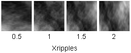 Determines how wavy the texture is in the X, Y, and Z directions. These parameters represent the scale of the fundamental frequency of the fractal used to generate the texture. The slider range is 0 to 20. The default value is 1.