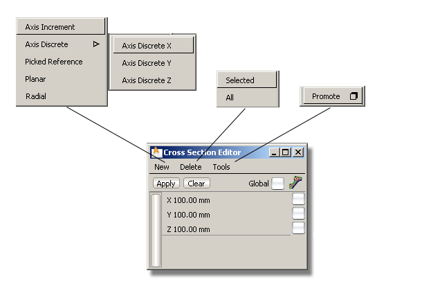 This menu lets you define sections in five different ways: Axis Increment, Axis Discrete (choice of X, Y or Z), Picked Reference, Planar, or Radial.