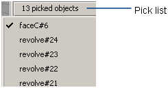 The Pick list isolates a single curve or surface from a collection of curves and surfaces. The white text field displays the name of the picked component.