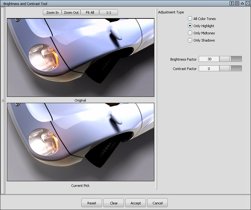 - To make the highlights brighter, set the Adjustment Type to Only Highlight, then increase the Brightness Factor, until the bottom image looks correct.